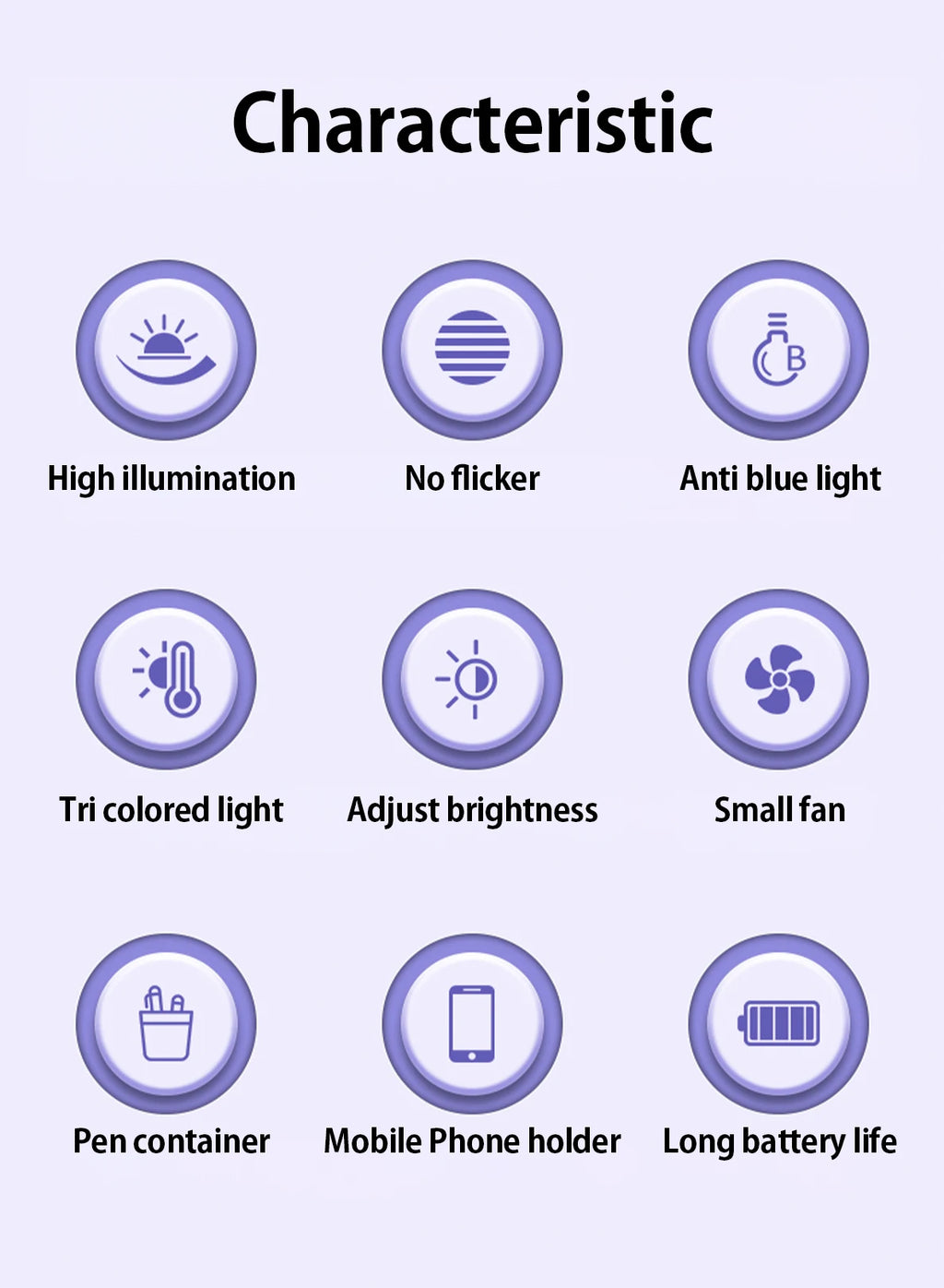 Com design moderno e multifuncional, ela combina luz LED ajustável, suporte para canetas/acessórios e até um mini ventilador USB para manter seu ambiente agradável enquanto você estuda ou trabalha.